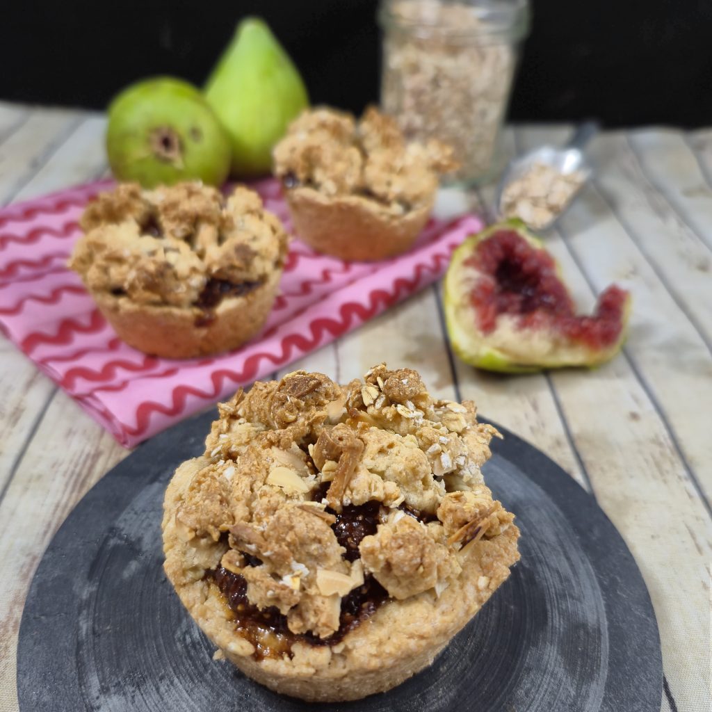 Ces gâteaux se conservent très bien. Ils sont aussi assez pratique à emporter. La compote de figues étant emprisonnée au milieu de la pâte. Pour le dessus de ces gâteaux j’ai ajouté des amandes et des flocons au reste de la pâte pour former un crumble gourmand.