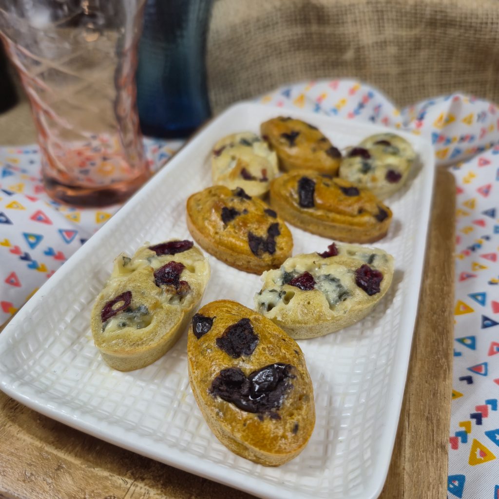 - Bouchée bleue : fromage bleu émietté dans la pâte, noix ou noix de pécan ou figues sèches en morceaux.