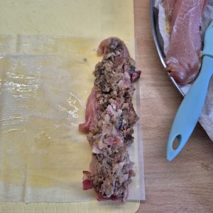 - Farce : la pancetta apporte des saveurs fumées et relève la farce. Les marrons eux sont là pour la douceur avec les champignons. Elle n’est pas complètement hachée pour conserver de la texture. Penser à bien l’assaisonner.