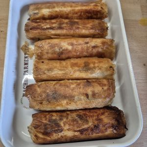 - Cuisson : la cuisson préalable à la poêle permet d’obtenir un croustillant bien régulier. Il faut mettre pas mal de beurre et d’huile dans la poêle et arroser les croustillant durant la cuisson. La cuisson au four permet de finaliser la cuisson de la viande et d’avoir une chaleur homogène. Les filets étant emballés dans la pâte ils risquent beaucoup moins de dessécher. Si vous voulez vérifier la cuisson, il faudra couper un rouleau croustillant en deux. Et le remettre au four si besoin.
