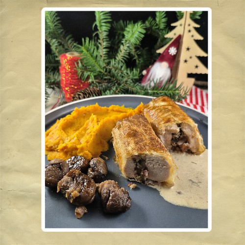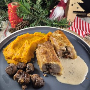 Pour accompagner ce croustillant de pintade, je vous propose une purée de potimarron. Elle s’accorde parfaitement avec et vous pourrez aussi la réaliser en avance. Vous pouvez ajouter une sauce aux cèpes déshydratés, elle sera vraiment idéale pour finaliser ce plat festif.
