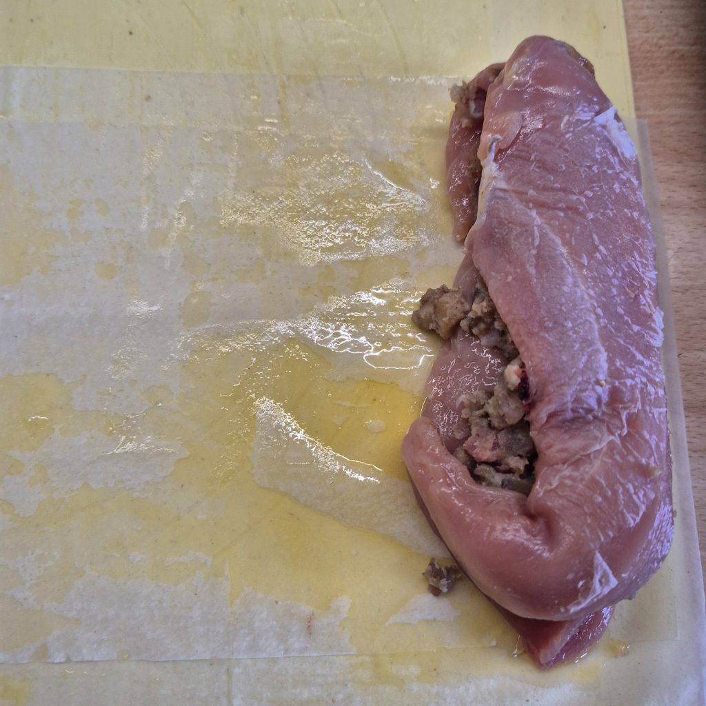 - Retirer la peau du blanc de pintade, couper chaque blanc en deux dans le sens de l’épaisseur, l’assaisonner et le déposer d'un côté de la feuille de filo beurrée en laissant de la place de chaque côté pour pouvoir rabattre la feuille. (pas comme sur la photo)